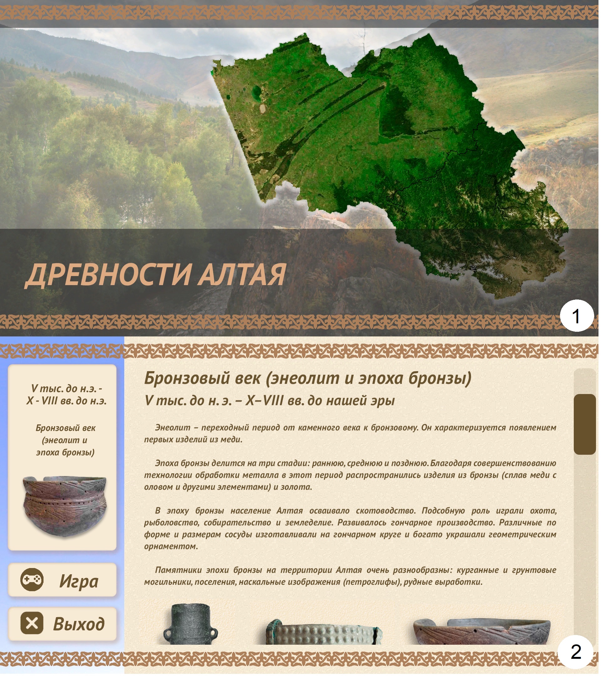 1. Информационная программа с элементами игры «Древности Алтая»: 1 – стартовая страница; 2 – страница описания исторического периода. Фото Н.Н. Головченко.